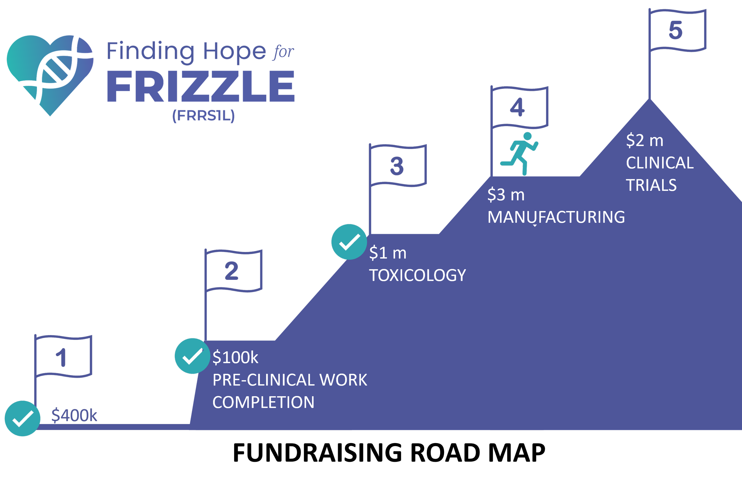 Our goal is to begin treating Frizzle patients by September of this year with the one-time dose of gene replacement therapy. We have a plan in place, partners ready, and a schedule to get this drug developed, but we just need the funds to get it to the finish line and in patients. We need to raise $4 million to pay for both the manufacturing of the actual drug that will be given to patients, as well as the costs of treating patients in a clinical trial. Every donation will go directly to changing lives and changing the world! Let’s stop Frizzle disease together!