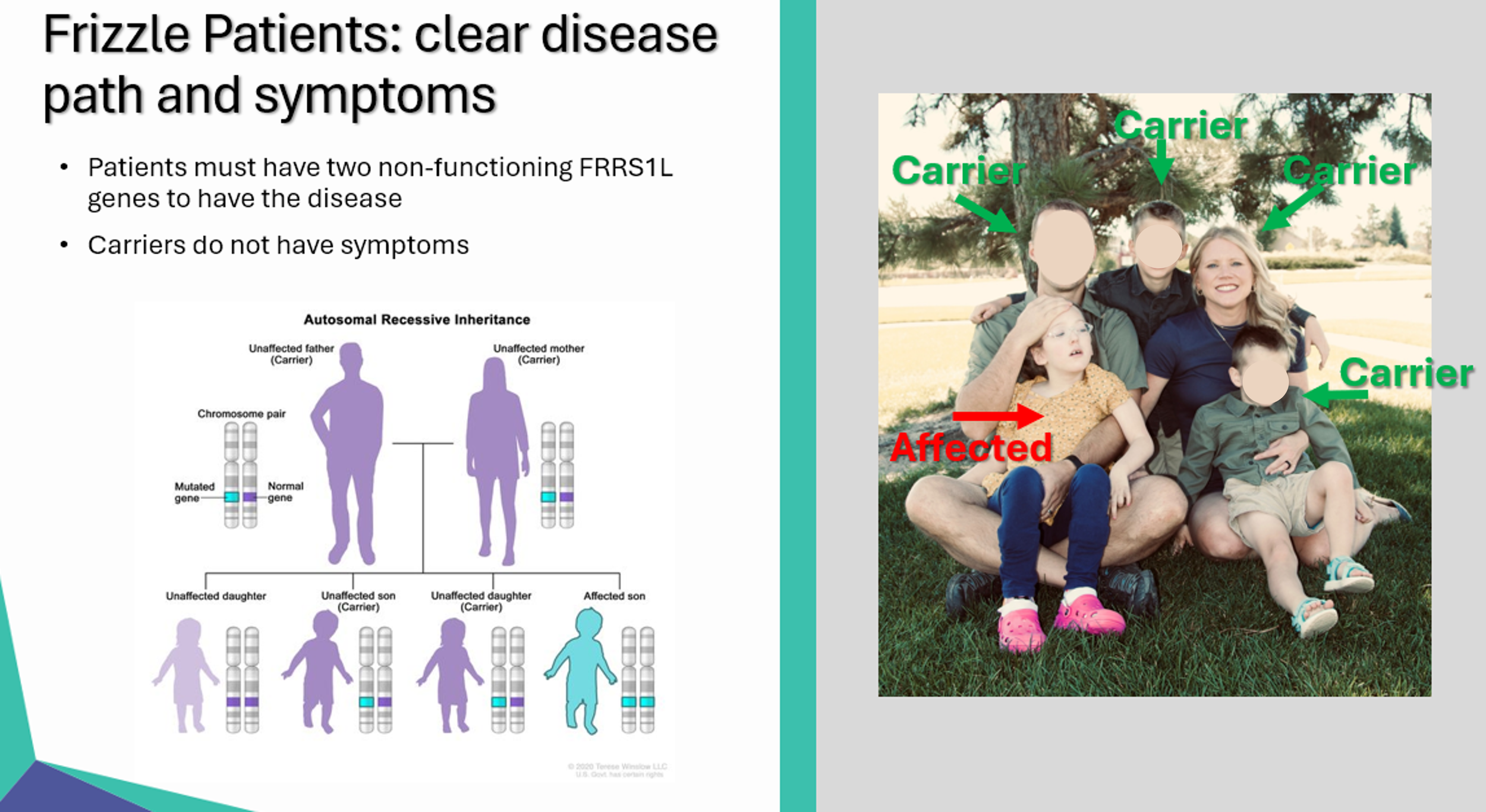 FRRS1L is a gene in all cells of the brain. Patients with Frizzle (FRRS1L) genetic disease have two non-functioning FRRS1L genes in every brain cell. Non-functioning FRRS1L genes causes the messages in the brain to not get through from one cell to another. These messages affect all areas of function and life for the patient. The resulting disorder produces epilepsy, progressive dyskinesis (abnormal movements), developmental delay, diffuse hypotonia, and global loss of function. Current research shows children having developmental delays, but still gaining abilities, and then between 6-24 months having seizures that cause regression, and rapid loss of function. Frizzle patients are trapped in a body they can’t move, however still retain high cognitive function, understanding, communication, and awareness.